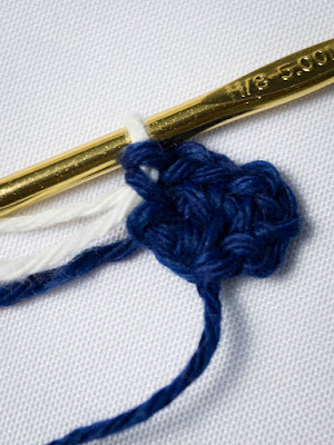 | Step 3: Bring Color B (white) back in front of Color A (blue). You are now ready to chain 1 with the blue yarn through the back bump of the chain. |